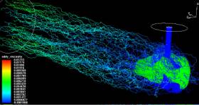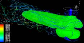 The 3rd set is the Eddy Viscosity plots. The light green object is the iso-surface of Eddy Viscosity. Everything inside the surface has a higher Eddy Viscosity and everything outside it will be less. The eddy viscosity has the same units as the kinematic viscosity, m2/s. This value when multiplied by the proper (Reynolds averages Navier Stokes - RANS) strain rate tensor produces the amount of "Reynolds shear" attributed to turbulence and then applied in the momentum equation (this is a very loose interpretation).