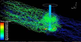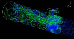 Figure 23 shows 4 different types of plots. The top and bottom ones have already been discussed. The second set is "mixing" tracer plots. Two sets of discrete tracer particles are injected to see how them mix. The blue comes from the beginning of the pipe and are uniformly distributed, just like the flow pattern tracers above. The green particles are added at the respective injection port. In the case of the HGR, it was below the lower impeller. In the case of the HGA, it was injected through a pipe just in front of each impeller. The colors this time have nothing to do with residence time. In both cases there is a fairly good mixture of these particles.