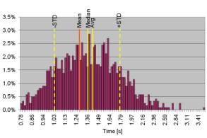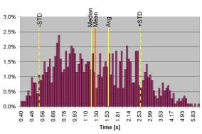 On the other hand, the size of the Eddy Viscosity iso-surface volume is much smaller for the two impellers of the LTA. Here is the case where two injection ports are upstream of the LTA. We can clearly see that some of the particles are completely missing these high-energy areas. Hence the poorer mixing. We can also see that the green particles (3 second residence times) are coming out of these surfaces. The maximum Eddy Viscosity of the LTA is only 0.006 m2/s. That means the green areas represent the surface where the values are 0.003 m2/s. This is much less than the other two examples. If we had chosen the same value, these surfaces would have been even smaller.