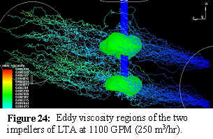 The eddy viscosity can be understood to be an indication of a turbulence magnifier. Looking at relative magnitudes of this value give an indication of the level of turbulence contained within the enclosed volume. What becomes important is the size and magnitude of the volume. For this study, the 50% level of eddy viscosity was arbitrarily chosen as a discriminator to illustrate a concept. Hence, the iso-surface corresponding to that value was determined. It should be realized that contained within this volume is a higher turbulence measure, and outside the volume is lower. The implication to mixing becomes the size of the volume relative to how long particles are resident within.
