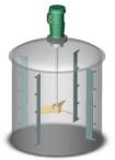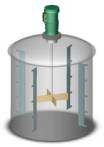Upper impeller is down pumping, lower impeller is up pumping. Segmented horseshoe baffle, and a criss-cross flow straightener. |