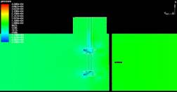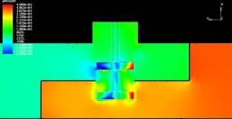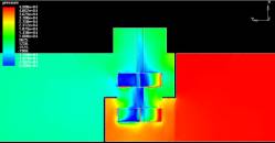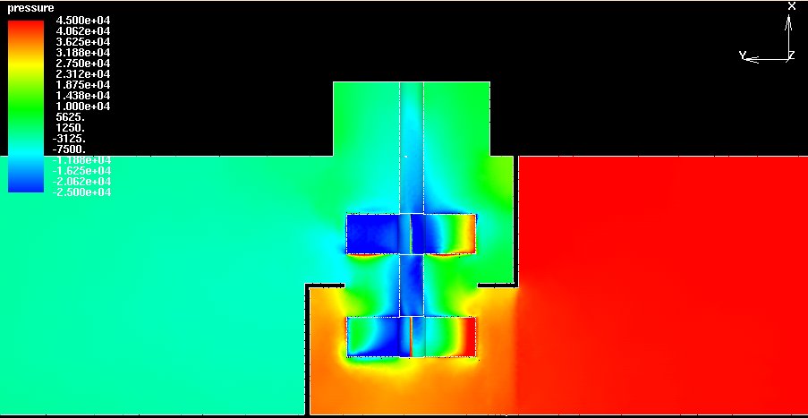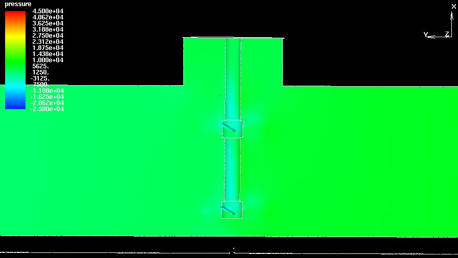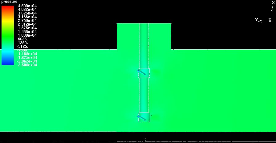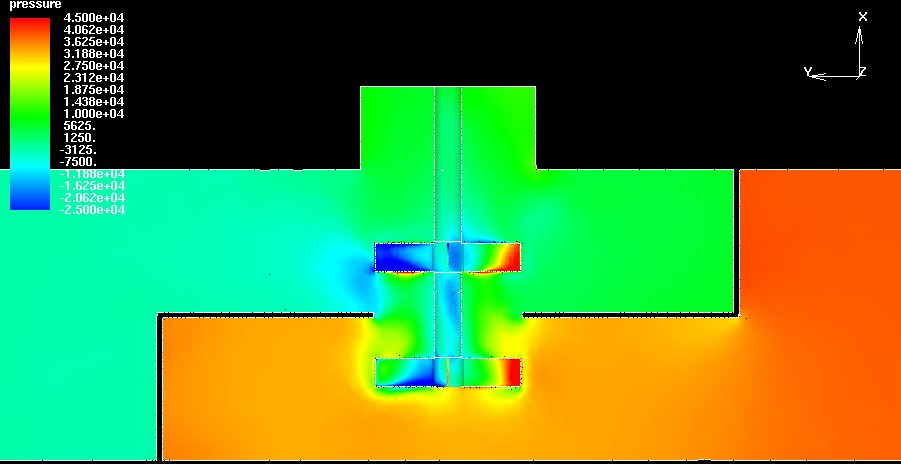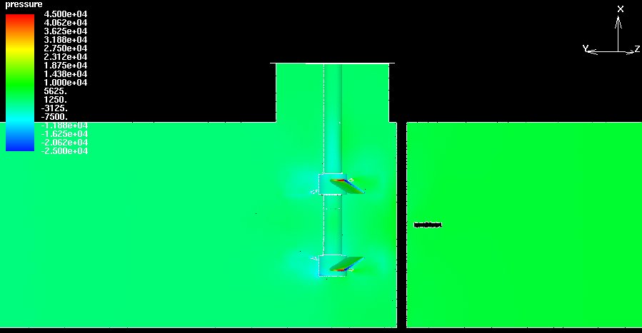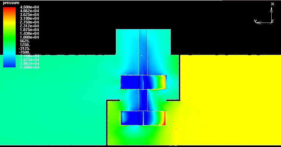 Unlike the pictures used to determine the pressure drop, these pictures are to show the pressure distribution and the relative comparison of pressure drop between the units. The scale is the same for each device. Red = 45,000 Pa (6.5 psig) is the highest pressure and blue = -2500 PA (-0.36 psig) is the lowest pressure (behind the blades: this was lost in Figure 8 because it was colored blue, just like the outlet). Bluish-green is in each case = 0, meaning that this shows pressure above the outlet pressure (gauge pressure). The numbers are in Pascals. The pressure drop is harder to determine using this representation, but it is very easy to see which units have the larges pressure drops.