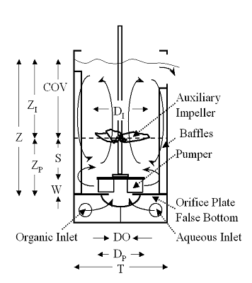 Thus, this pilot plant will have one pumper and one auxiliary impeller in the pump stage. When planning for a pilot plant, variable speed drives and impellers that can be adjusted on the shaft are very important, since equations 7-10 are approximate. If air entrainment is noticed, the impeller speed can be reduced and/or the upper impeller lowered. If puddles of organic are noticeable at the surface, the impeller speed can be increased, and/or the upper impeller put closer to the surface.